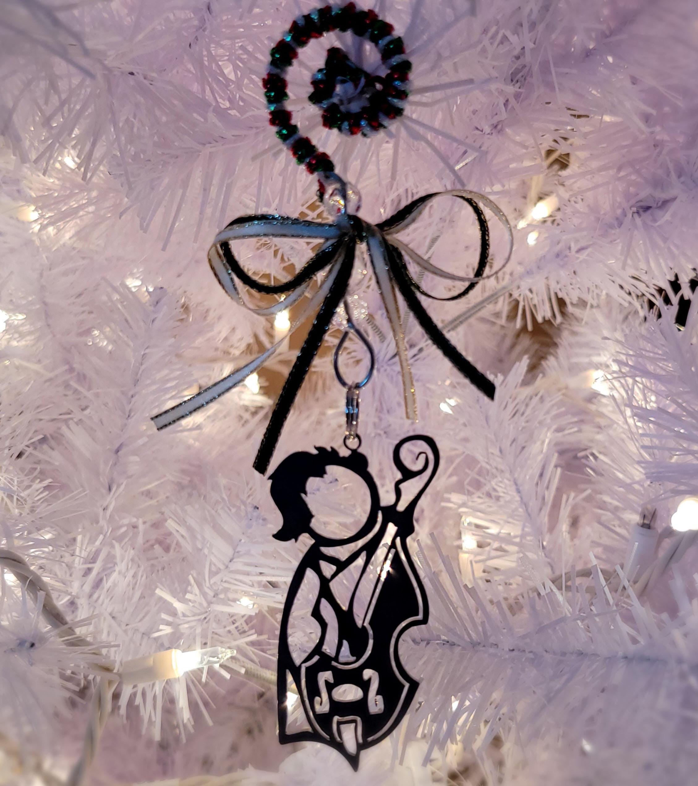 Whimsical Female stick figure playing a cello or upright bass musician great for band or orchestra members. Made from 18 gauge stainless steel with either a Tumbled (matte) or a Brushed (shiny) finish. Comes with a nickel plated 6mm split ring. Measures approximately 1-1/2" wide by 3-1/2" tall.