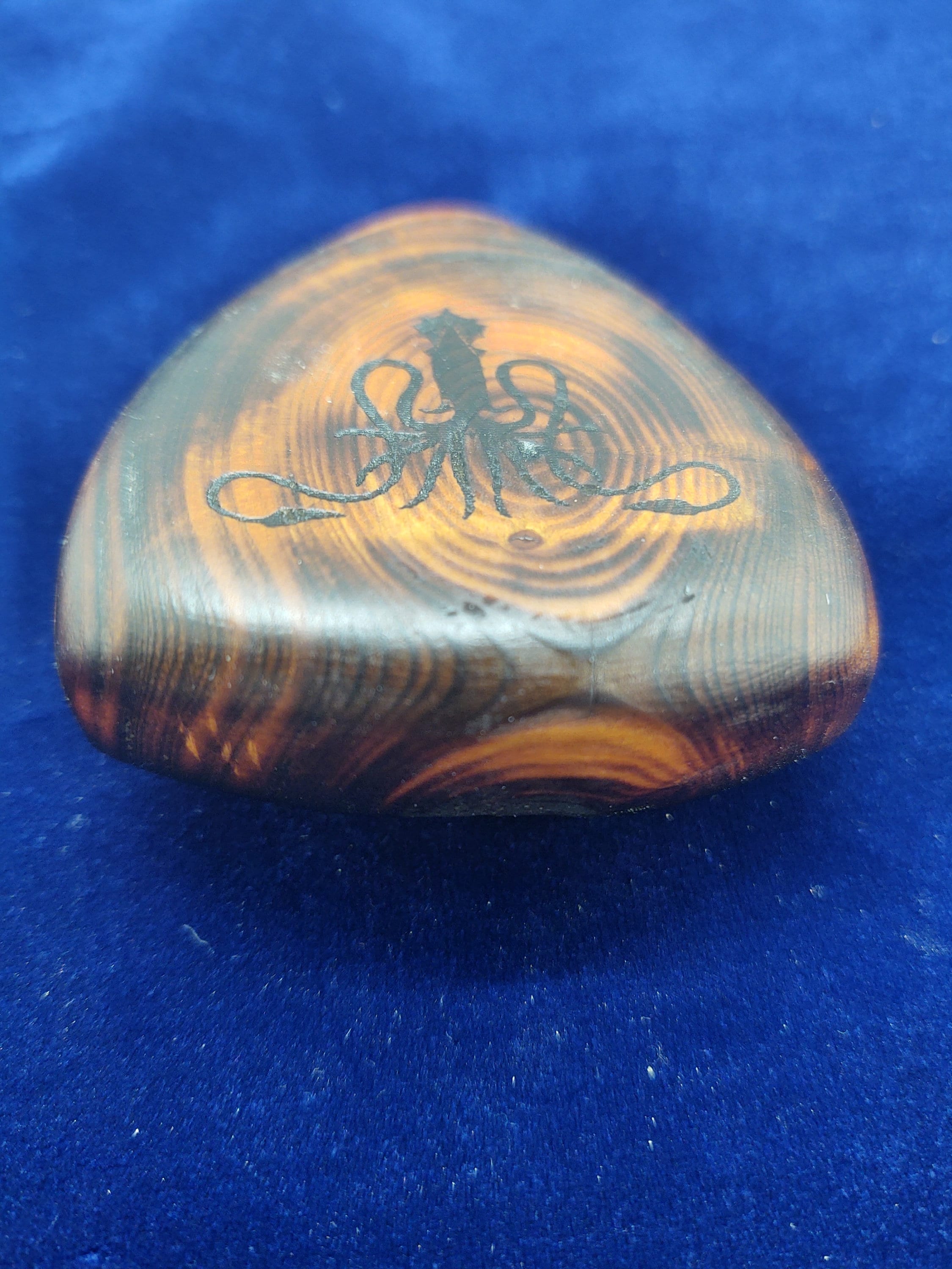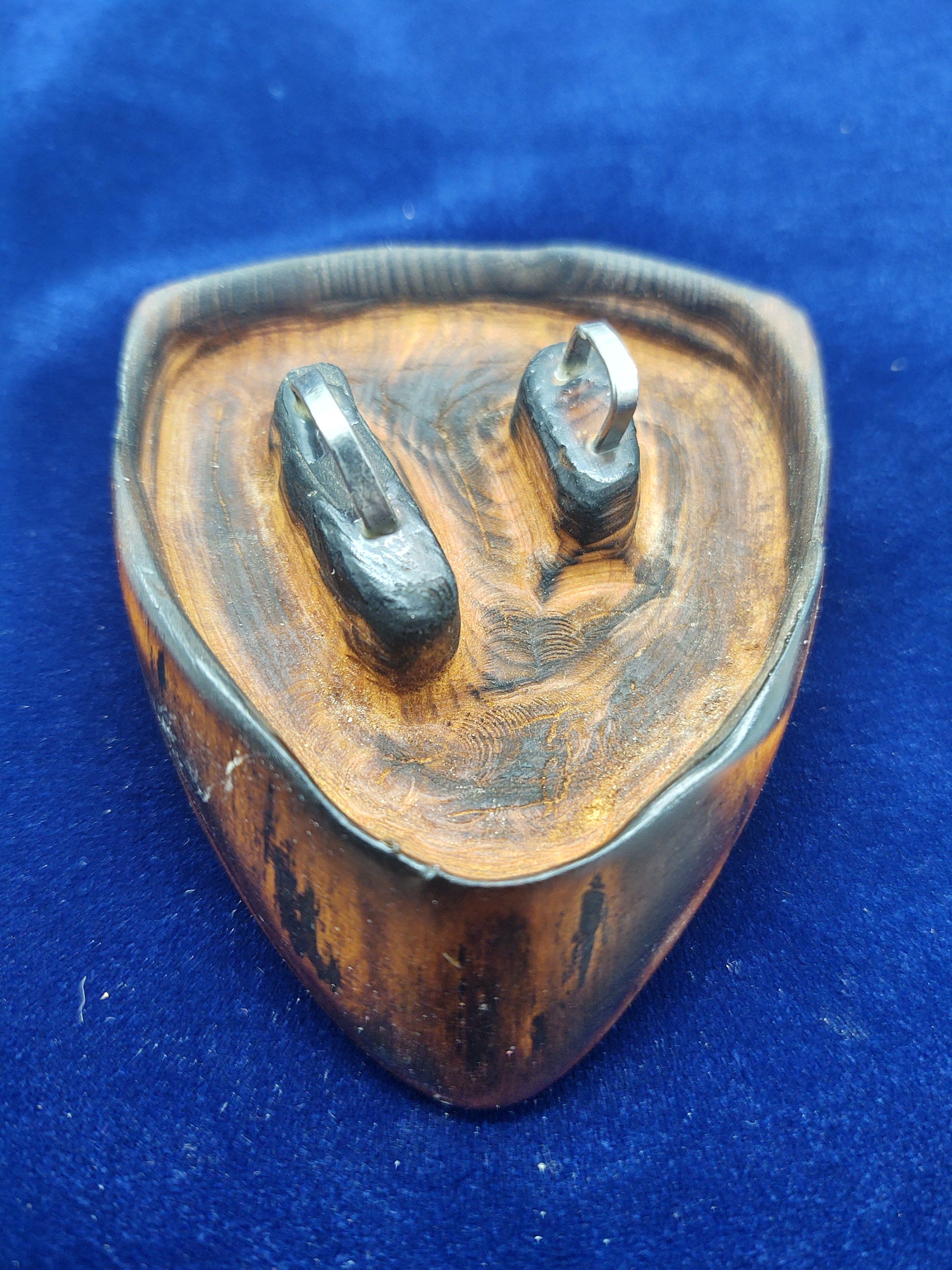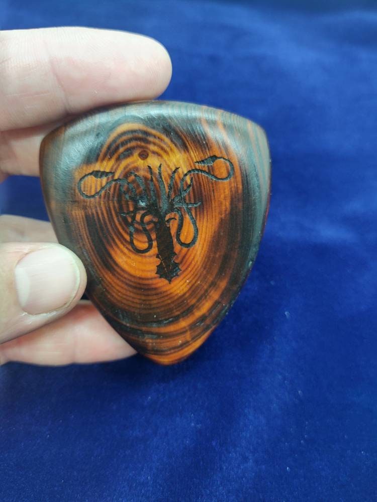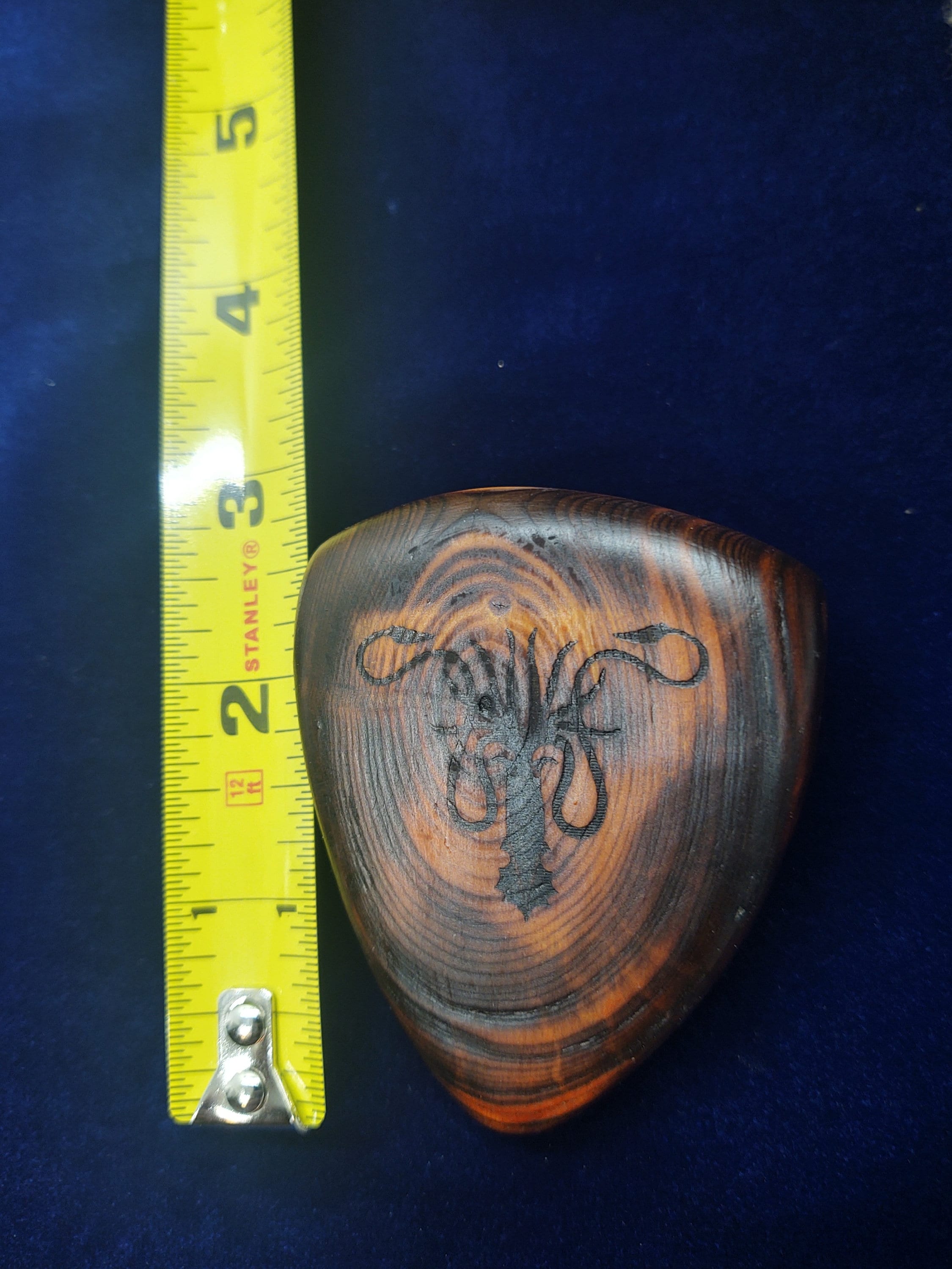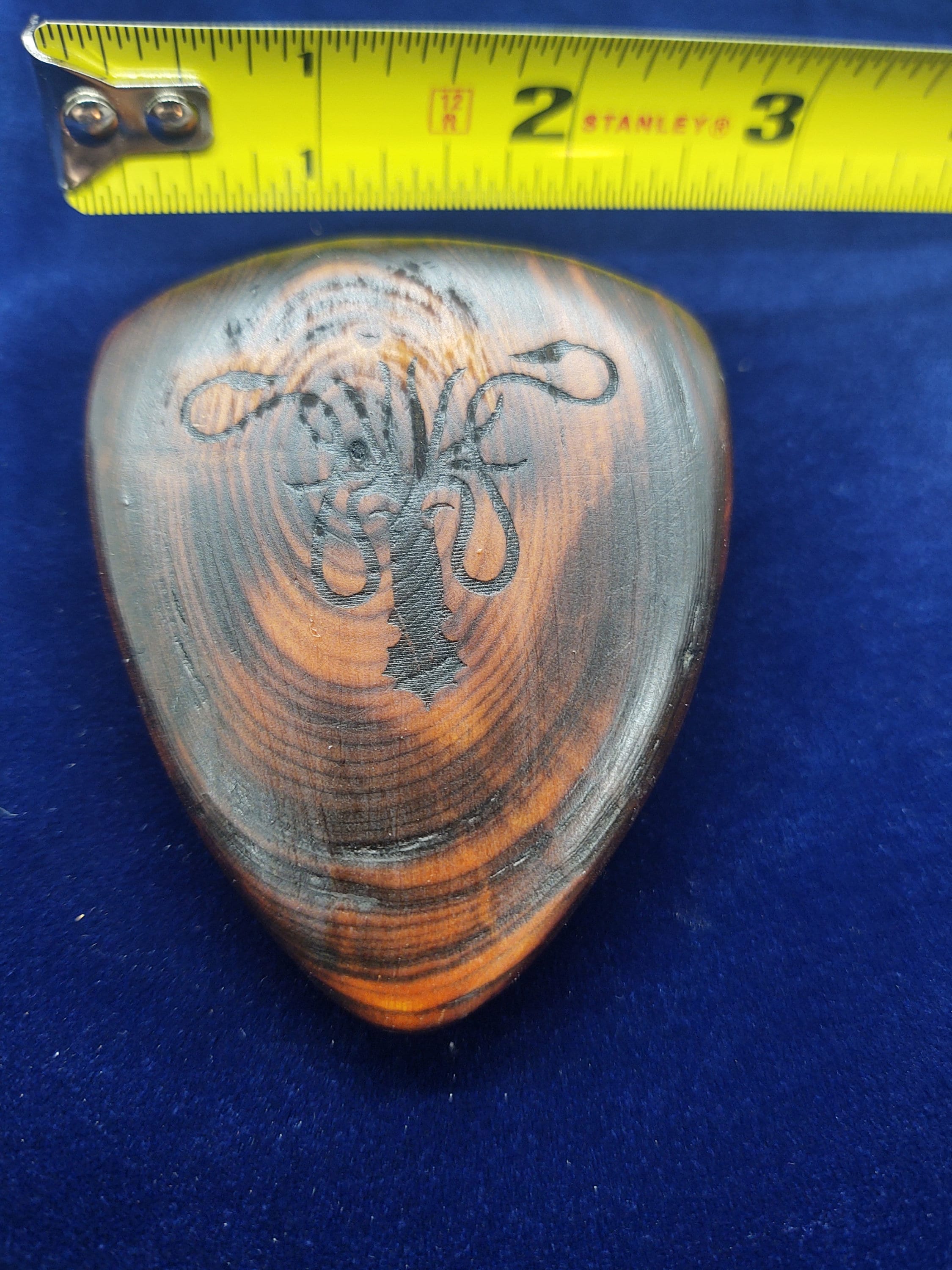Miniature Wooden Shield with a Sigil Laser marked onto the face. This item is carved out of a round of wood cut from a fallen evergreen tree branch. It measures 2-1/4 inches wide by 2-3/4 inches tall and approximately 1/2 inch thick. The back was carved out using a Dremel and the hand holds were fashioned from small nails hammered flat and shaped to fit. The wood has been burned slightly with a torch and then stained. See the other listings I have for similar items with Sigils.